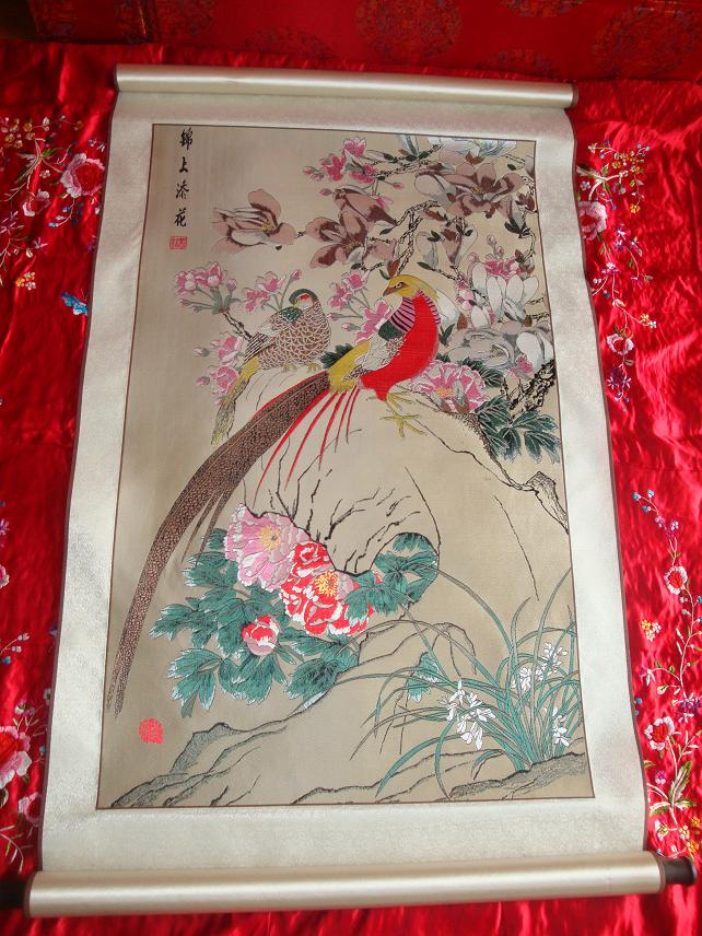 传统蜀锦采用的是传统手工挑花结本, 过花, 手工编连上百上千上万纸样纹板,和上机织造为主,锦画表现形式重彩工笔画。彩墨成块面型状的画,色彩愈多的画优势愈明显;传统蜀锦:1、色彩明快鲜艳;2、画面具有浮雕立体感;3、不同角度欣赏锦画光线会折射出不同的色彩,惟妙惟肖。