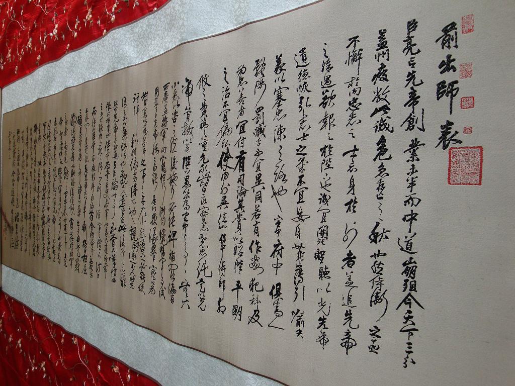 手工出师表 蜀锦 成都手工艺品 四川民间工艺品三国时代蜀汉丞相诸葛亮所作。诸葛亮(公元181至234年):字孔明, 东汉末琅琊阳都(今山东沂南县)人。三国时期,一代贤相,辅佐刘备,联合孙权,曾于赤壁击败曹操建立蜀汉,与魏、吴形成鼎足三分的局面,诸葛亮被任为丞相。刘备去世后,诸葛亮受遗诏辅佐后主刘禅,对内精兵简政,对外东和孙吴,南服孟获,兴师北伐曹魏,先后六出祁山。《出师表》更加表现出诸葛亮对汉王朝,对刘备父子的赤诚忠心,这也是后世许多人对诸葛亮倍加尊崇,在三国中视蜀汉为正统的重要原因之一。